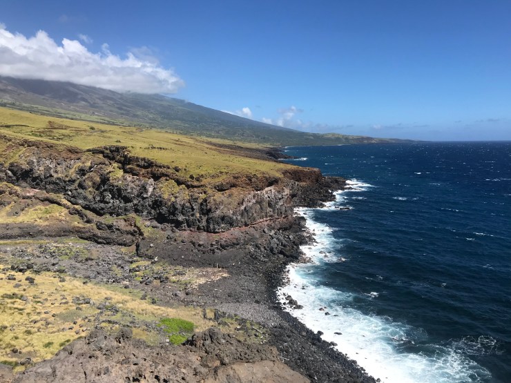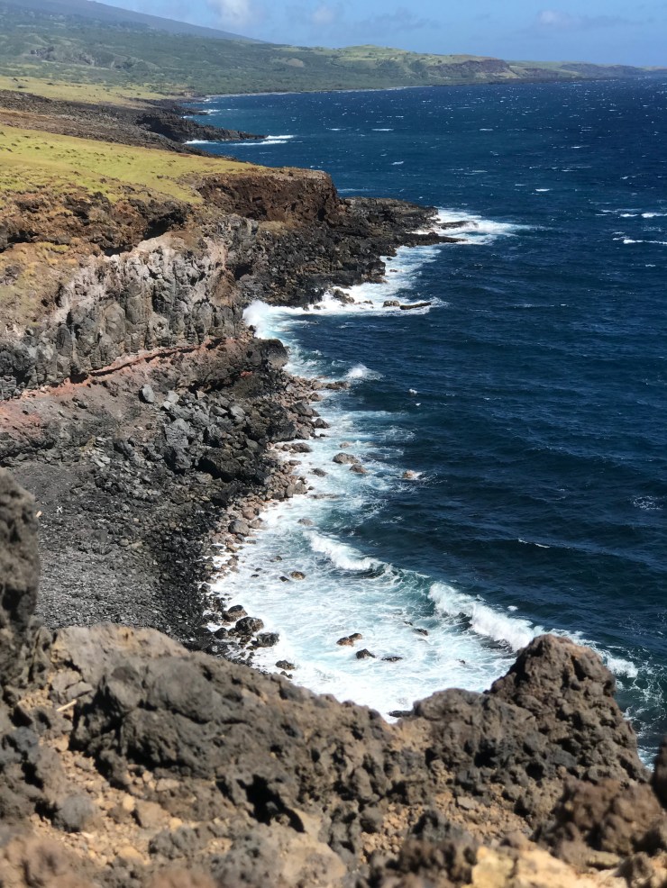 For my last full day in Maui I decided to drive to Hana. On my aunt Julie’s advice I drove the reverse way- heading up country on Hwy 37, which becomes 31 (Piilani Hwy), and coming back on the northeast shore. When I looked at a map, it looked like this road went straight through the middle of Maui, so I wasn’t sure what views I would have. I quickly learned that this is by far a more jawdropping, breathtaking part of the drive. For those who drive the “normal” way to Hana and then turn around and head back that same direction, you miss out on the prettiest part of the drive! But as to whether I’d recommend driving this way… you definitely have far less traffic in front of you, but the closer you get to Hana (when the roads are at the most narrow and you have two-way traffic on one-lane roads) the more you have to deal with heavy traffic coming at you in the opposite direction. So you end up having to stop, pull over, back up, and wait WAY more than traffic taking the normal route- because when there are 10 of them in a row and only 1 of you, they only have to stop or pull over once, while I had to do so 10 times; you see the point. If you want to avoid traffic, just get a very early start. Also, when driving on this stretch of road, there are limited options for places to stop for food, drinks, and a bathroom. I decided to grab a coffee at “Grandma’s Coffee House”, a cute place fairly early into the drive on Hwy 37; they also have a lot of food and plate lunch specials. This turned out to be the last place to stop for food until you get close to Hana (which is another hour-plus away); the only other establishment you pass is the only winery with tastings on Maui, maybe they have food too? But Grandma’s does not have a bathroom you can use, boo! When driving on Piilani Hwy you pass by black lava rock beaches and spectacular views of this deep-blue water beating against the island’s cliffs. The photos below, as beautiful as they aren’t don’t do the scenery justice.